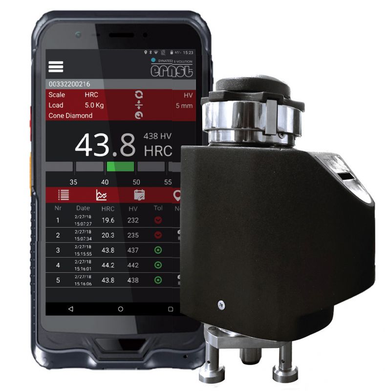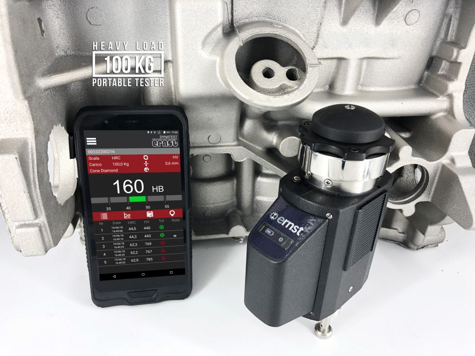 Bauteilen in unterschiedlichen Positionen (vertikal, horizontal oder Überkopf) verwendet werden. Die Härte wird durch Berechnung der Eindringungsdifferenz zwischen Vorspannung und Last gemessen und direkt auf dem Display angezeigt. Die Messung wird nicht durch das Nachgeben und die Deformation des Prüfkörpers beeinflusst. Das tragbare Härteprüfgerät ist mit verschiedenen Adaptern ausgestattet, die leicht austauschbar sind, um sich an die unterschiedlichen Formen der zu messenden Proben anzupassen. In der neuen Version verwendet das e-dynatest ein Tablet, das für die industrielle Umgebung geeignet ist. Die Android-Applikation bietet die Möglichkeit, Daten einfach und schnell zu erkennen, verwalten, teilen, speichern und drucken zu können. Darüber hinaus kann das e-dynatest mit einem Stativ verwendet werden, das speziell für die Überprüfung kleiner Teile oder all die Teile, bei denen eine Unterstützung erforderlich ist, entwickelt wurde. All dies wurde durch die Entwicklung eines neuen dynamischen Systems erreicht, bei dem die Belastung des Eindringkörpers in sehr kurzer Zeit und ohne jeglichen Aufprall fortlaufend wirkt. Der e-dynatest ist mit einem Rockwell Diamantkegeleindringkörper und einem Hartmetallkugeleindringkörper ausgestattet.