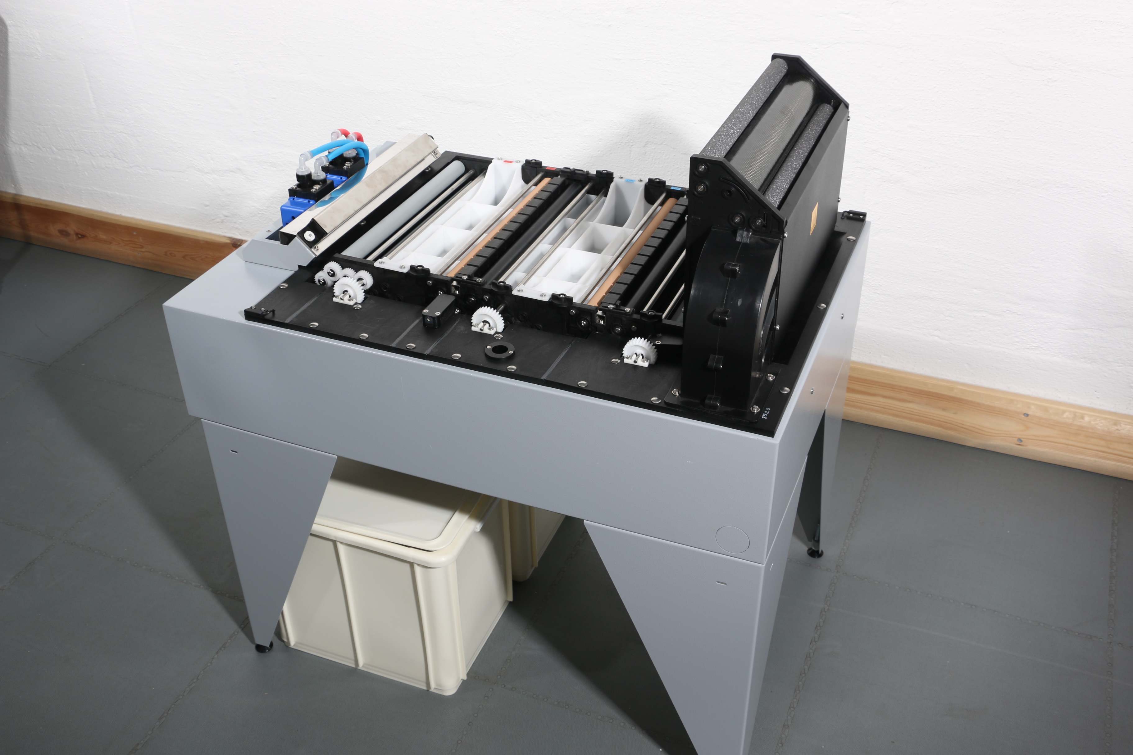 Eine wirtschaftliche Film-Entwicklungsmaschine (auch als reine Tischversion verfügbar) mit einer Durchlaufgeschwindigkeit von 13 cm/min bei einem Standardverarbeitungszyklus von 8 Minuten.